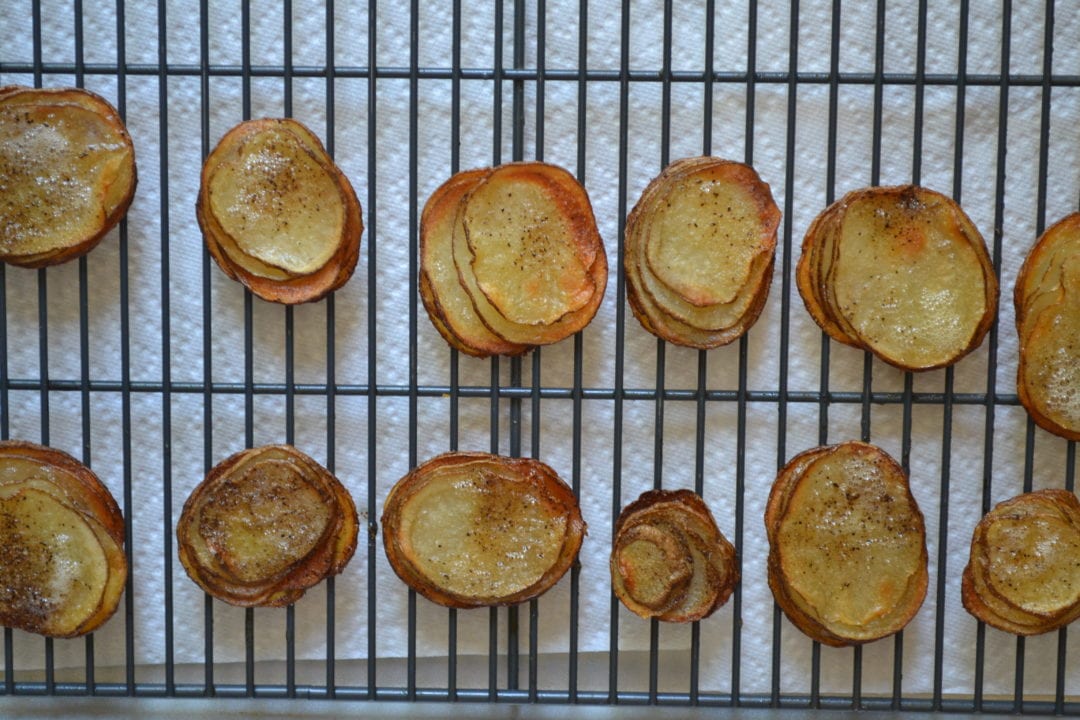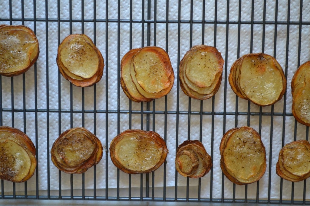 Place the baking sheet of potatoes in the oven and roast for 40 minutes. Check the potato stacks at 20 minutes to make sure that the stacks have not toppled over. If they have, simply use a fork to re-stack them.