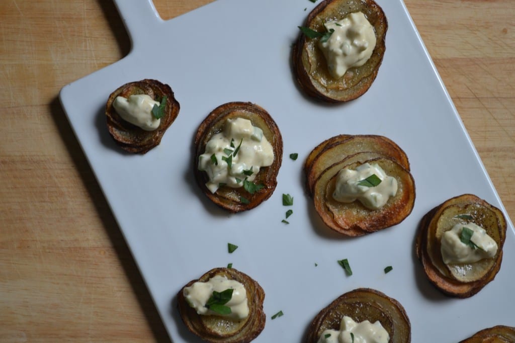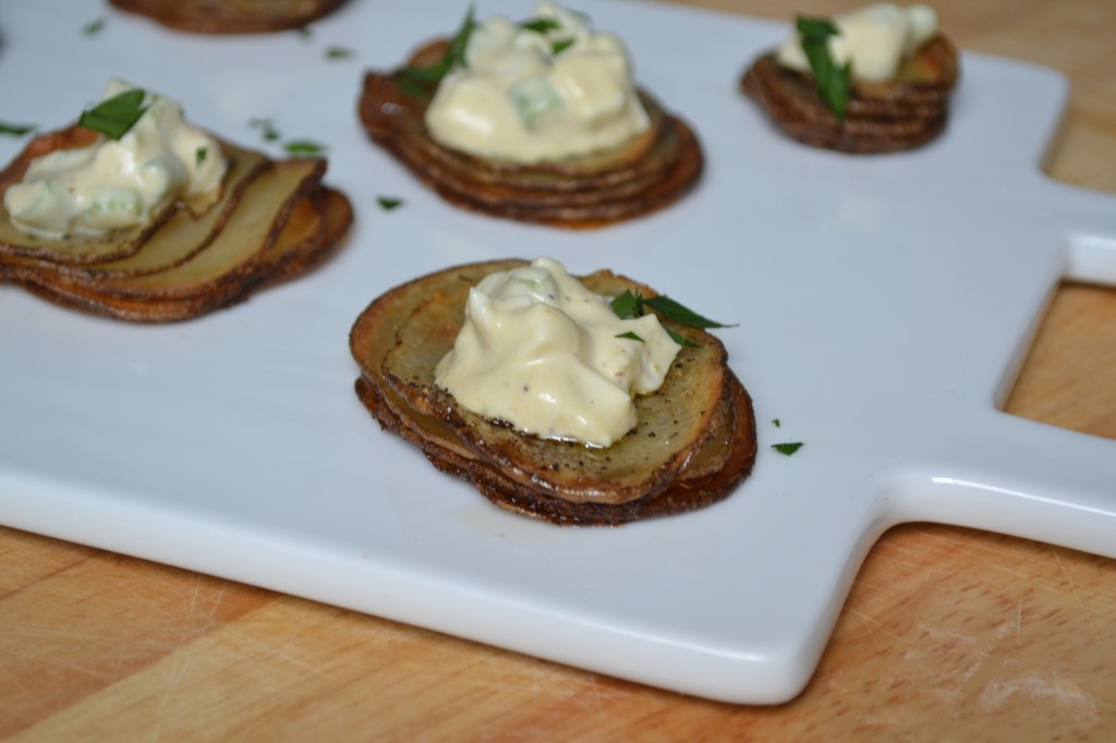 Top each potato stack with a spoonful of the topping and maybe a dash of some fresh chopped parsley. Each potato bite can be served warm or at room temp.