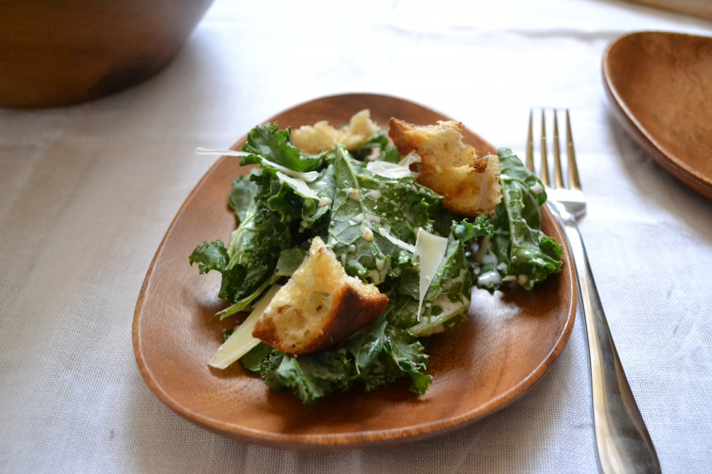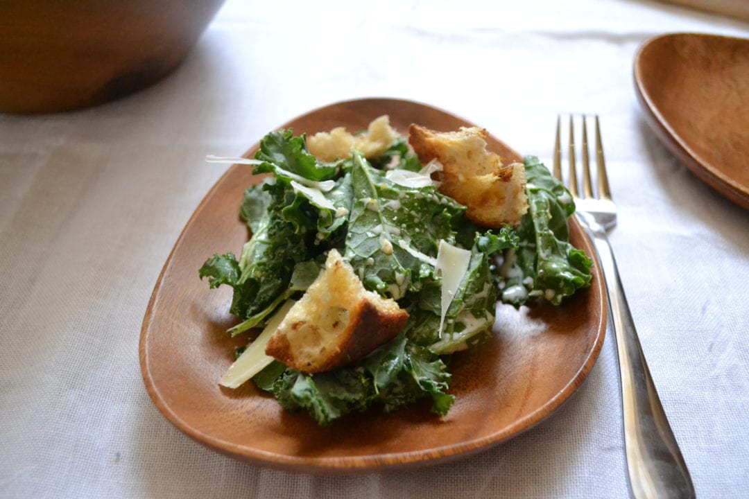 I am so happy to share with you this light take on a Caesar salad. I used Kale instead of lettuce and a dash of white wine along with some non-fat Greek yogurt in the dressing to switch it up a little bit.