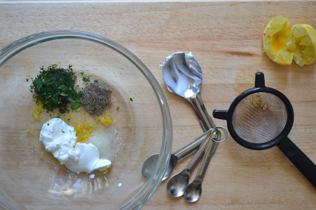 While the pasta is boiling, get together the ingredients for the dressing. Add the lemon juice, lemon zest, salt, pepper, yogurt, olive oil, dill and parsley to a large salad bowl. Whisk to combine.