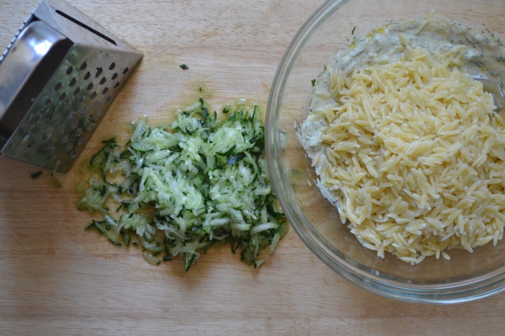 Drain the pasta when it is done cooking. Allow it to cool before combining it with the tzatziki sauce. In the meantime, grate a cup of cucumber. Try and not place excess liquid from the grated cucumber into the bowl.