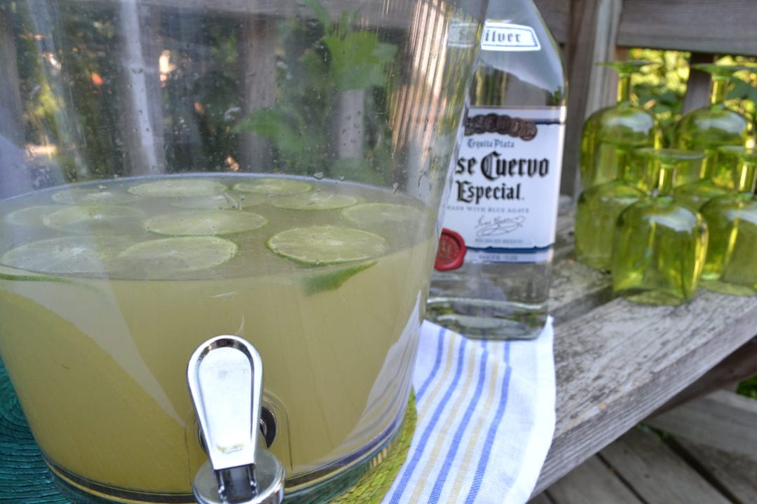 In a large pitcher or beverage dispenser, combine the simple syrup with the zest in it, lime juice, and cold water. Add some ice cubes and lime slices if you are serving right away. Feel free to serve this warm with ice and lime slices on the side.
