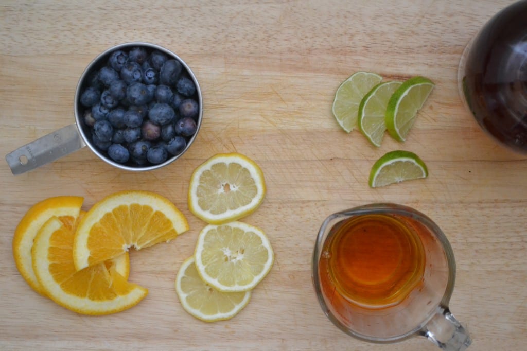 Pour half of the bourbon/blueberry liquid into the bottom of two glasses. Add a few cubes of ice to each glass along with a ½ cup of soda water/seltzer water, ½ a teaspoon orange juice, ½ teaspoon lime juice, and ½ a teaspoon lemon juice.