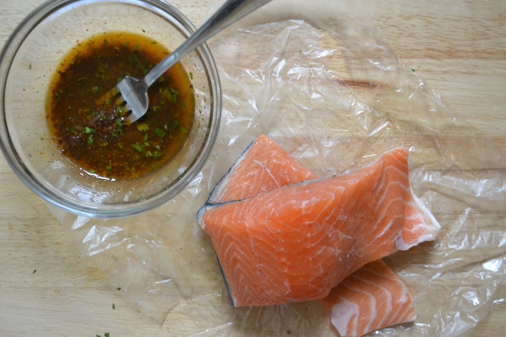 Add the salmon filets and the marinade to a large plastic ziplock bag. Refrigerate the bag while it marinates for at least thirty minutes and up to two hours.