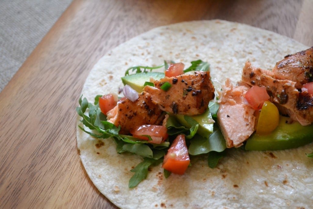 Cut salmon filets into small chunks and place on a tortilla along with whatever topping you desire.