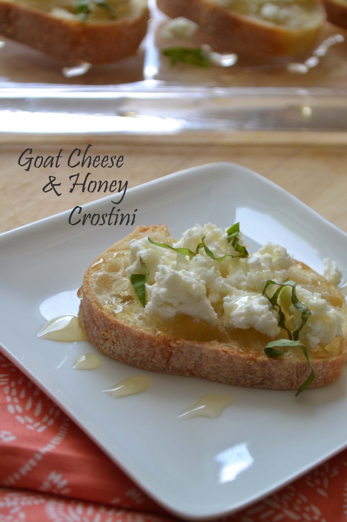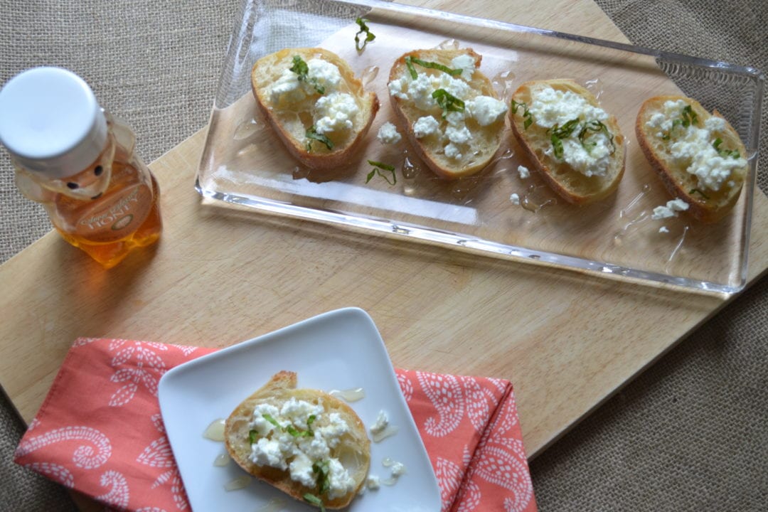 Top each piece of bread with a few crumbles of goat cheese. Arrange the slices on a plate.