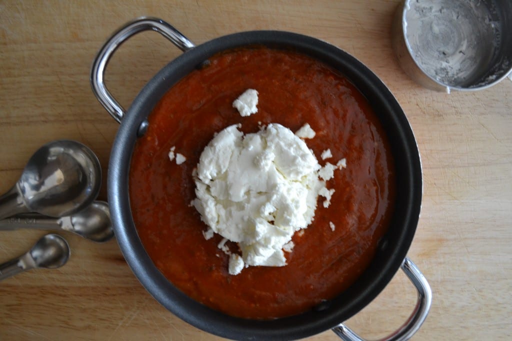 - Add the marinara to an oven-safe baking dish. Top with chunks/slices of goat cheese.