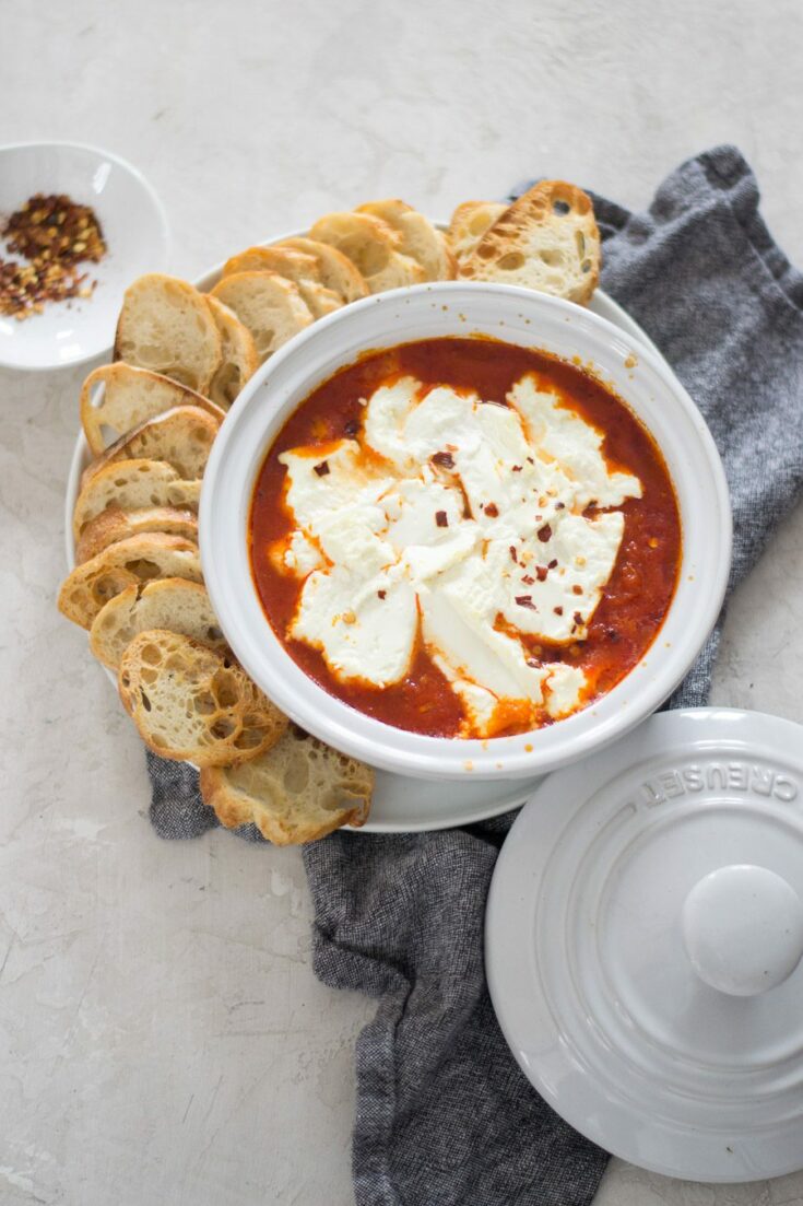 Baked goat cheese is a warm and cozy dip that is made with TWO ingredients! Throw it together last minute and serve with toasted baguette slices.