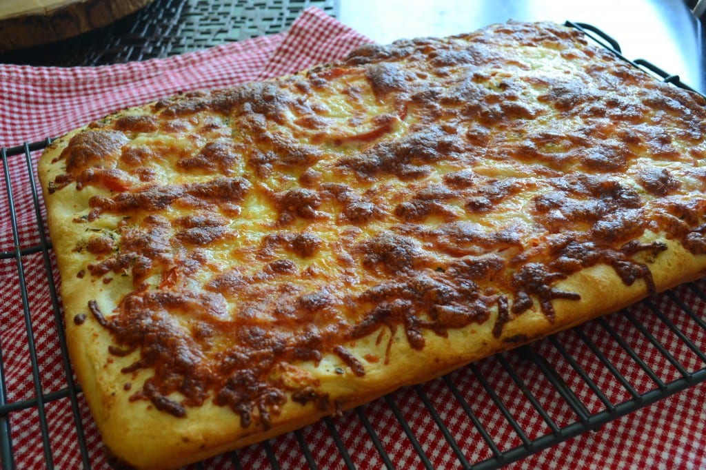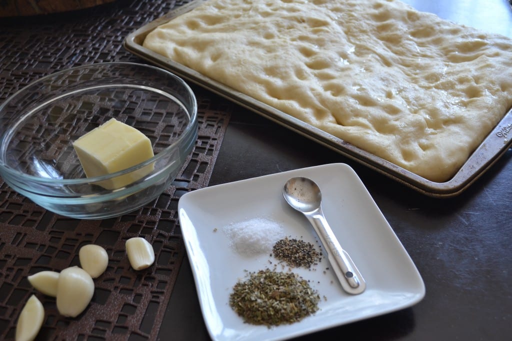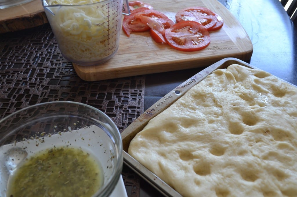 Lightly oil a 9″ x 13″ baking sheet. Press the dough into the 9-by-13-inch baking sheet. Poke holes all over the dough with your finger. Drizzle the dough with the remaining olive oil. Let rest for 20 minutes. It should puff back up again.