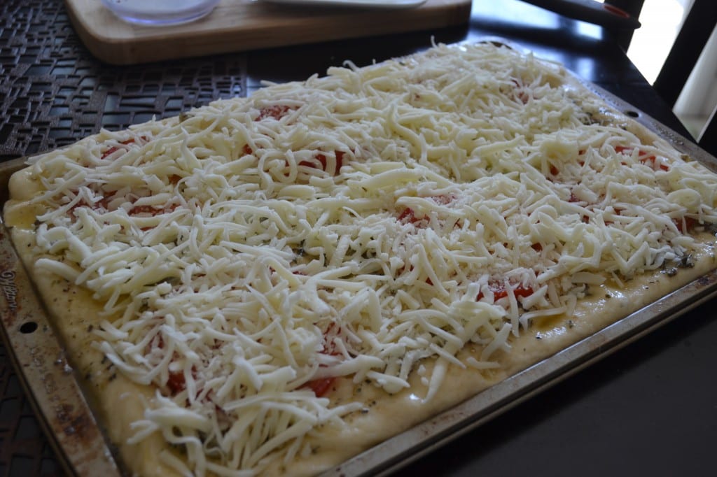 Melt the butter in a small microwave safe dish bowl for a minute or two. Mix in the grated garlic, Italian seasoning, salt, and pepper. Liberally brush on the garlic butter mix, make sure to cover the entire piece of dough. Arrange the thin slices of tomato on top of the dough.