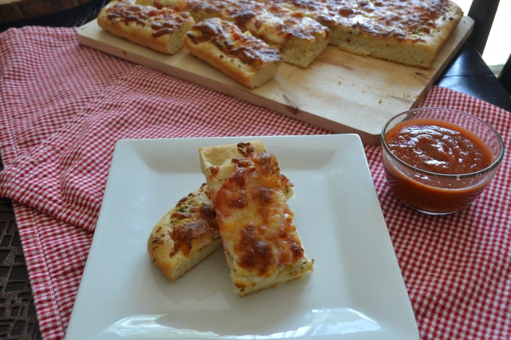 Let cool on a wire rack for a few minutes. Slice the bread into 12 to 15 one inch wide and three inch long pieces. Serve the bread along side a great pasta dish, salad, or eat as an appetizer with a side of marinara.