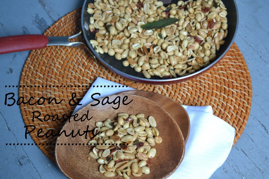 Add the peanuts to the pan and roast them for about six minutes until they turn golden brown. Turn the heat off and remove the pan from the burner. Crumble the sage leaves and bacon into the peanuts. Add a dash of salt and pepper to the peanut mixture, mix to distribute.