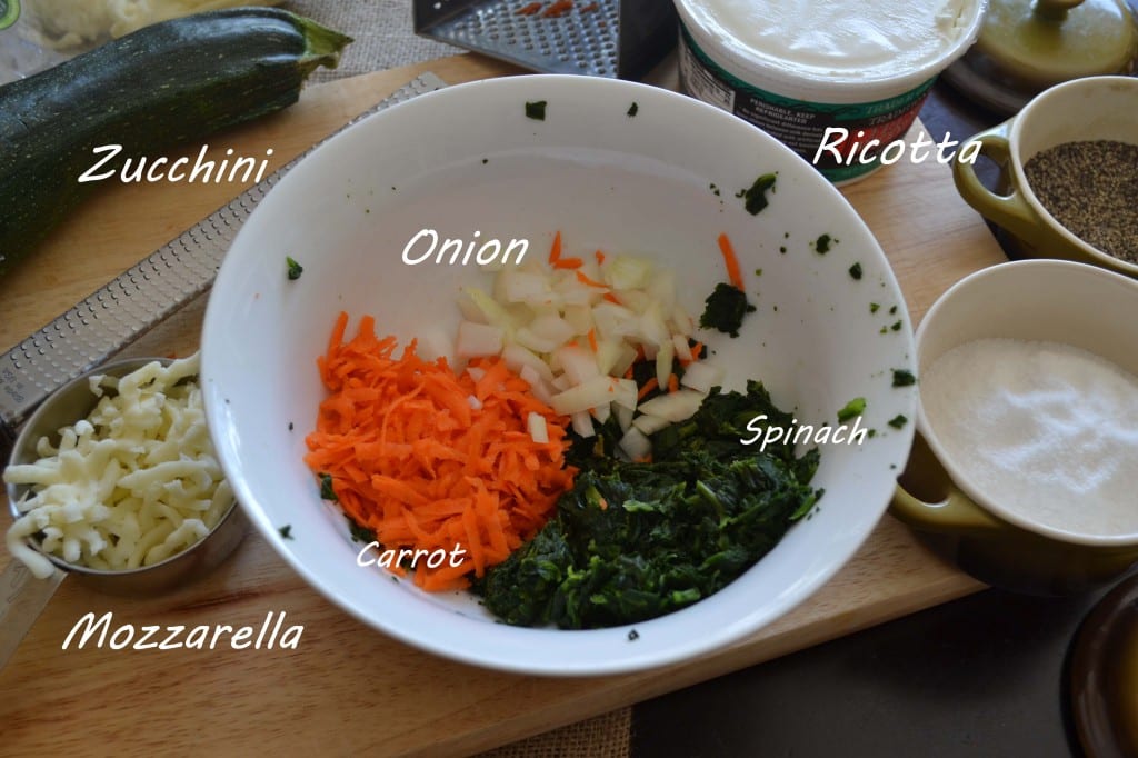 In a medium mixing bowl, combine shredded carrot, chopped spinach, chopped onion, garlic, salt, pepper, crushed red pepper, Italian seasoning, ½ cup shredded mozzarella, and ricotta. Mix to combine.