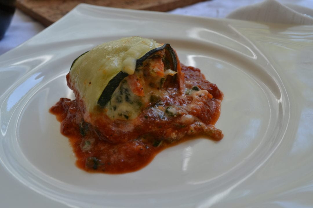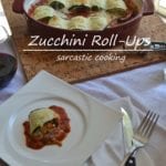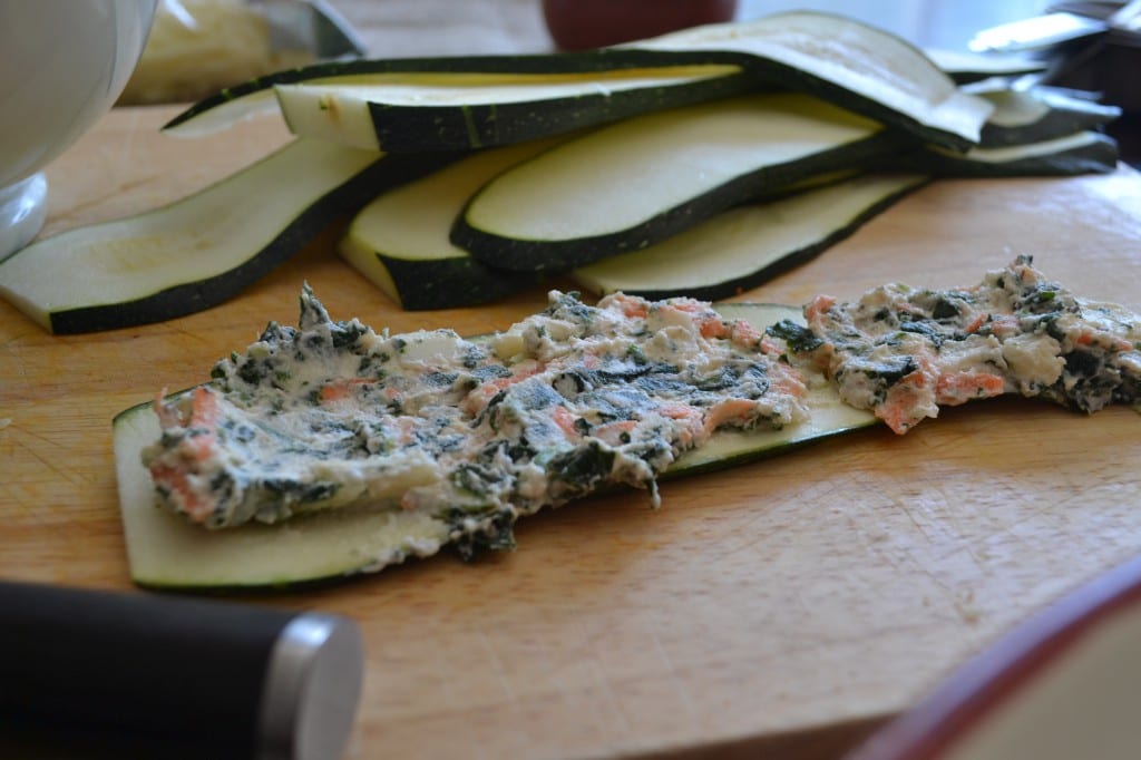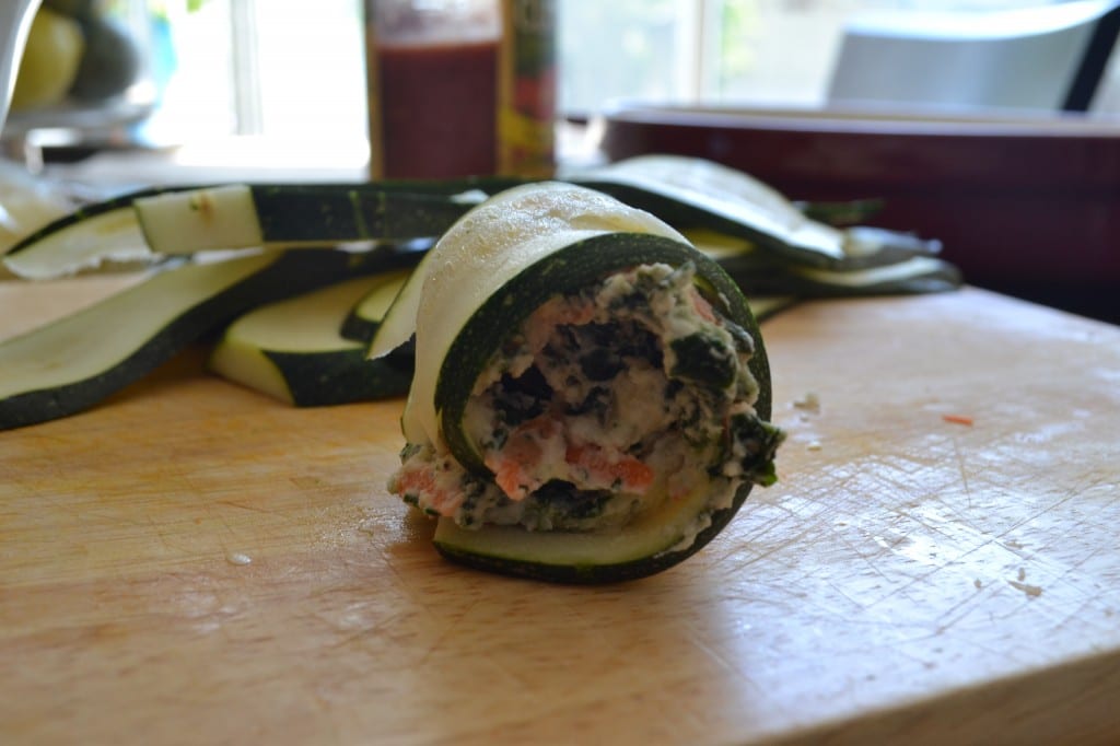 Lay a slice of zucchini out on a work surface. Spread about a tablespoon of the filling along the length of the zucchini. Roll the zucchini from the thinner end to the wider end. Lay the roll seam-side down into the baking dish with marinara. Continue this process until all slices have been rolled.