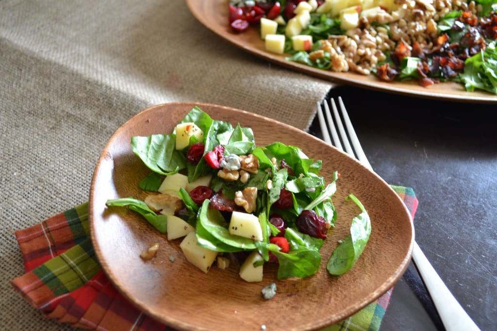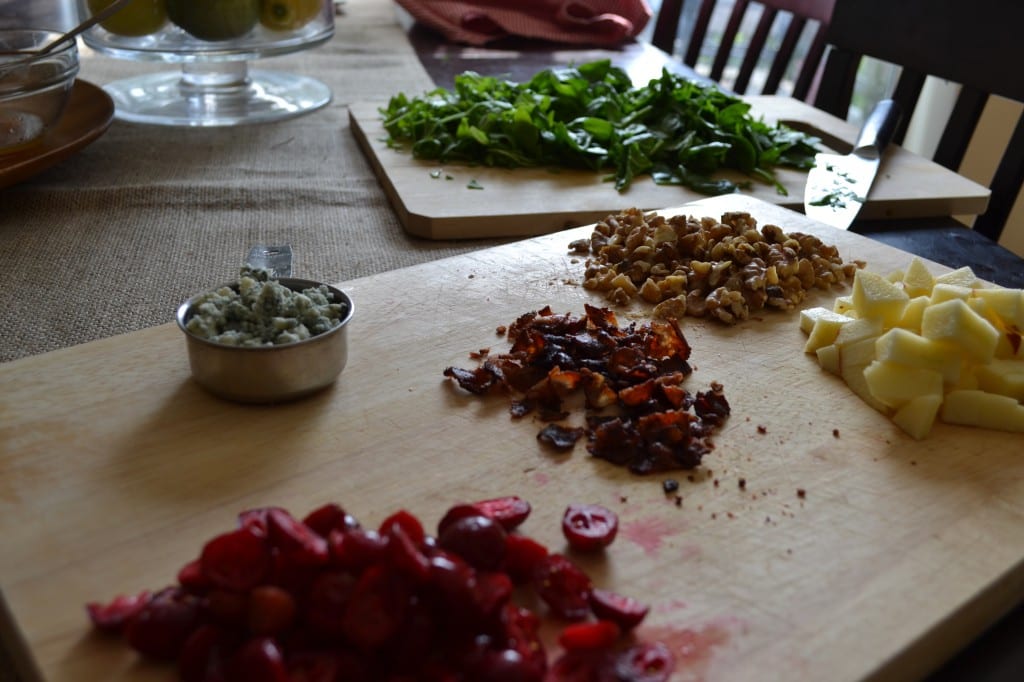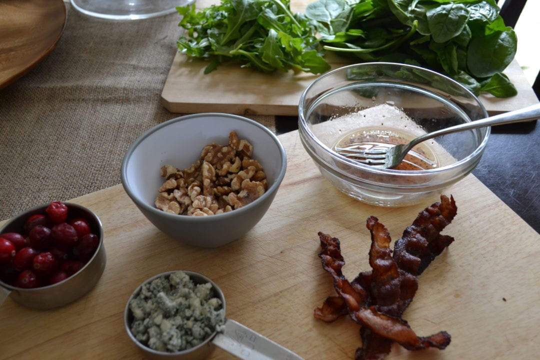 Arrange apple, walnuts, cranberries, bacon, and blue cheese on top of the greens.