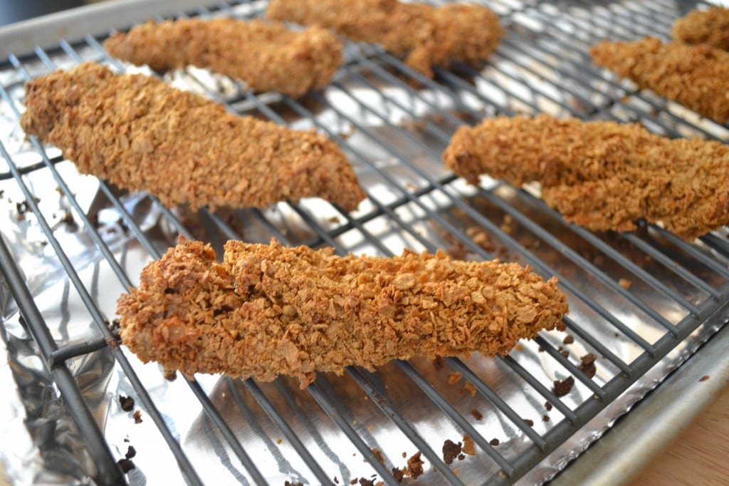 Dip one tender at a time into the egg and then into the bran flakes. Place each coated tender on to the wire rack. Continue until all tenders have been breaded.