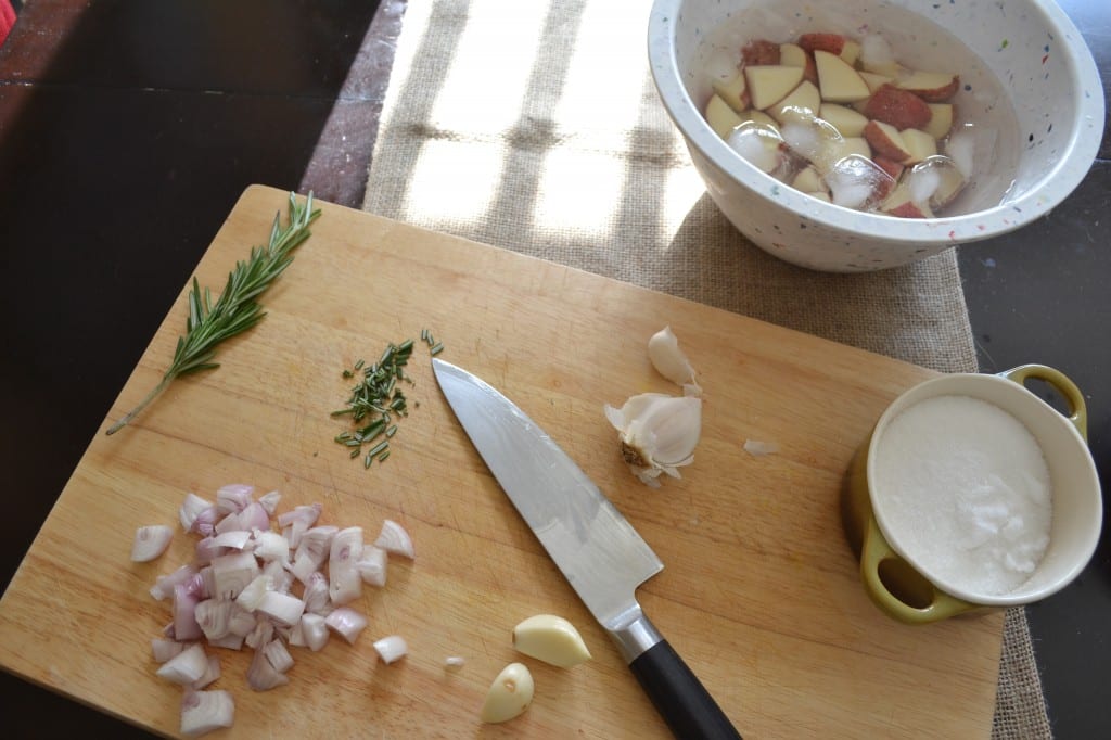 Place the cut red potatoes in a large bowl of ice water to soak for at least 20 minutes. This will make for crisp potatoes.