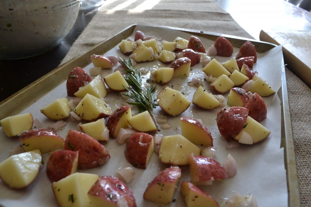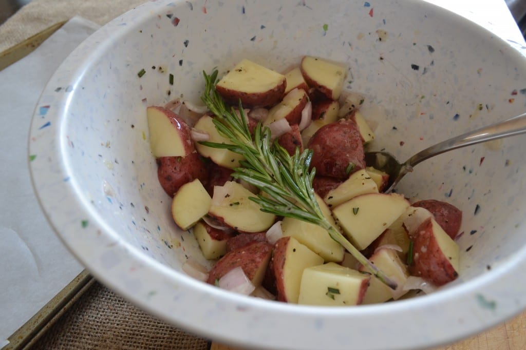 Spread the potatoes, onions, and rosemary out on a baking sheet lined with a piece of parchment paper.