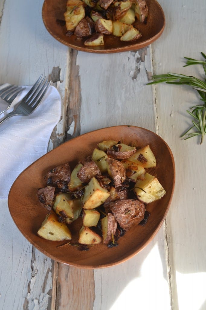 Combine the red potatoes, shallot, garlic, chopped rosemary, rosemary sprig, olive oil, salt, and pepper in a large mixing bowl. Mix to combine.