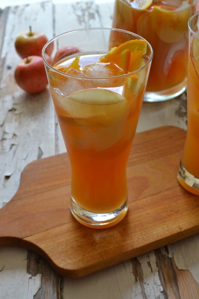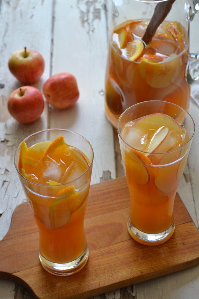 Thinly slice the apples making sure to discard any seeds. Slice and quarter about half an orange. Place fruit in a large pitcher.