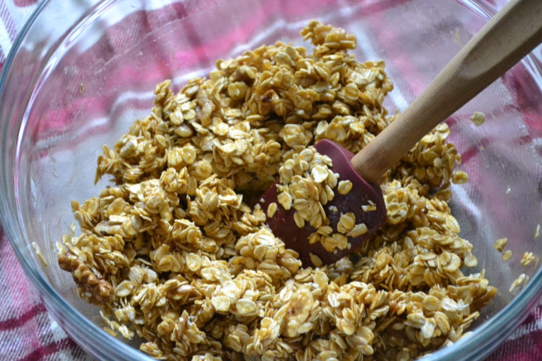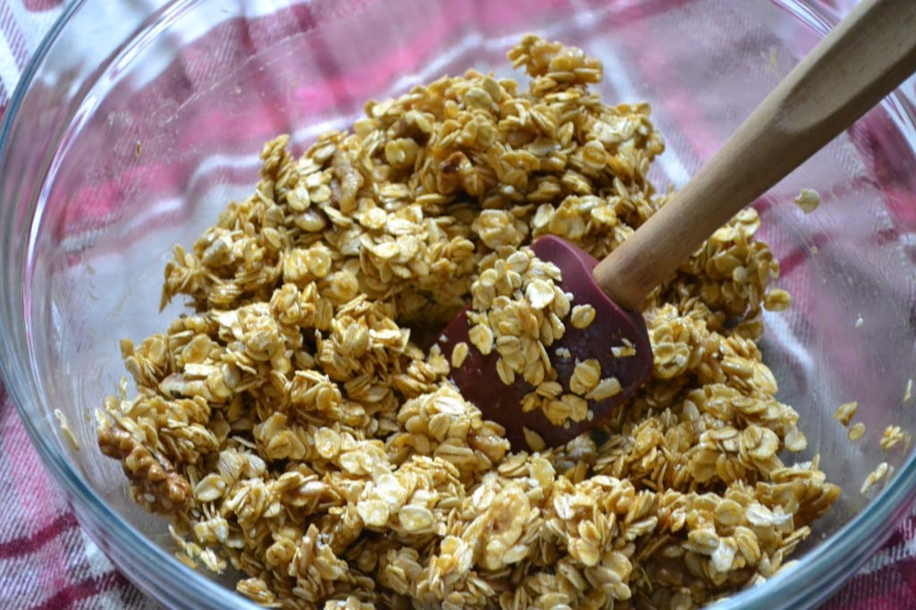Add oats, walnuts, sunflower seeds, and sesame seeds to the bowl. Mix well.