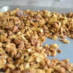 Spread the granola mixture out in one even layer on a large baking sheet lined with parchment paper. Bake for 20 minutes and then remove from oven and mix. Bake for another 15 to 20 minutes until golden.