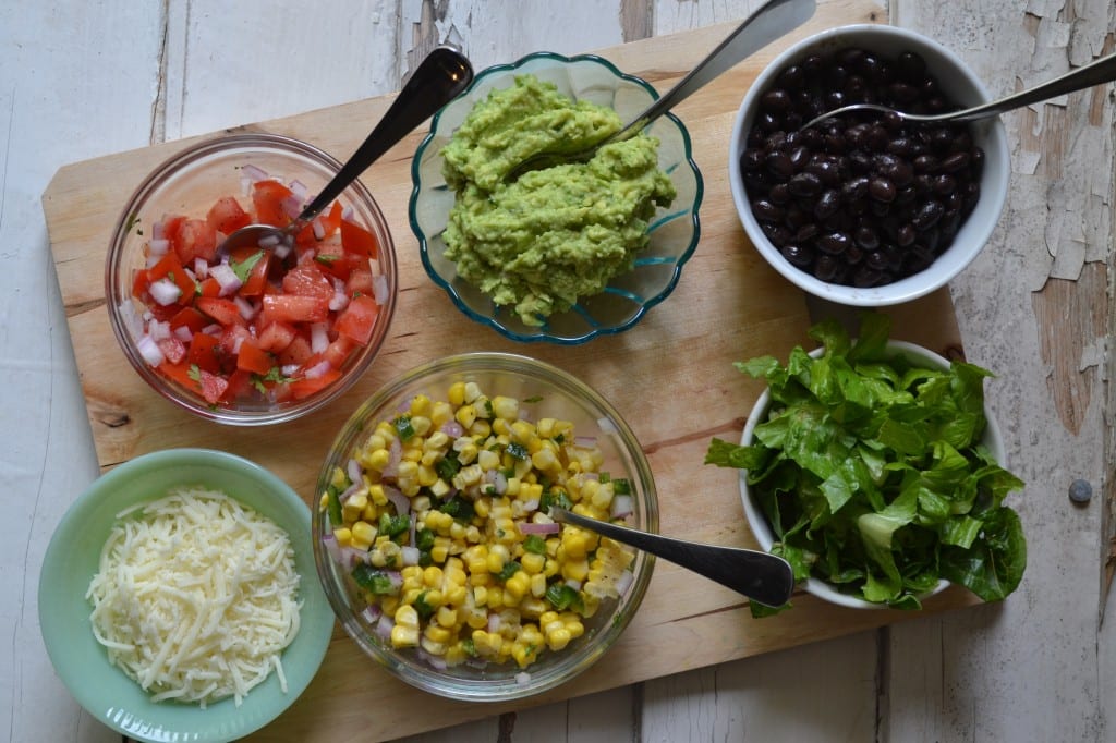 Fill various small bowls with shredded lettuce, shredded cheese, sour cream, and salsa/hot sauce if you are using them. Start an assembly line. Layer each plate/bowl with a big spoonful of quinoa, a spoonful of black beans, meat, pico, corn salsa, cheese, lettuce, and then guacamole. Eat and enjoy!
