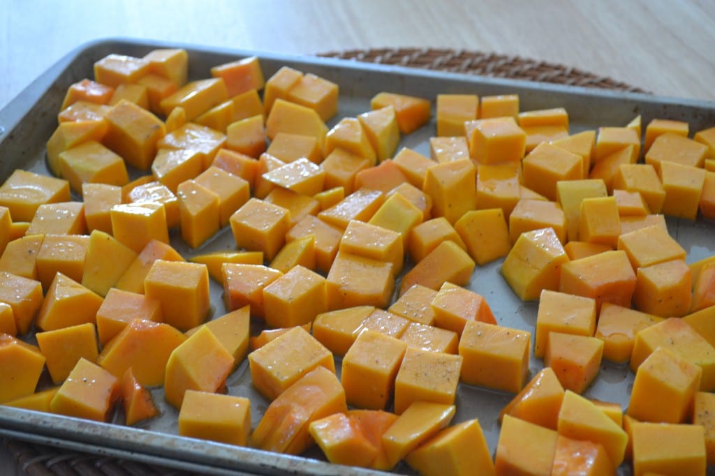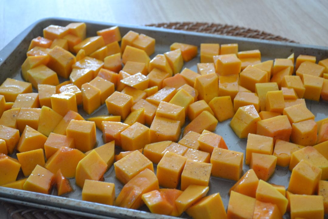 Peel the butternut squash. Cut the stem and a bit of the base off and discard. Remove the seeds and “guts.” Cut the butternut squash into cubes. Arrange the cubes of squash on a medium baking sheet, coat in olive oil, and roast in the oven for 40 minutes. Remove the squash from the oven after 20 minutes and give it a stir to rearrange it on the pan.