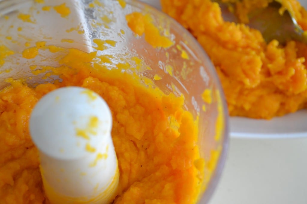 When the squash is done roasting, let it cool for five to ten minutes. Once it is cool, add the squash to a food processor and puree until smooth, about two minutes. Set the puree off to the side while you make the cheese sauce.
