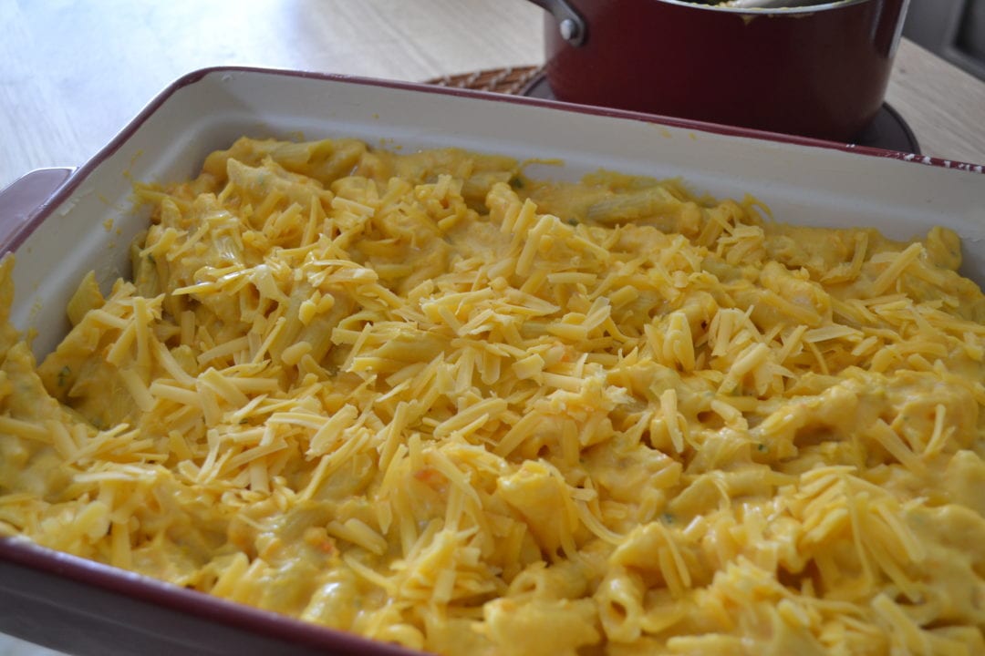 Grease a large baking dish. Add pasta and sauce to the dish, mix to distribute. Top the mac and cheese with remaining shredded cheese. Bake in the oven for 25 minutes until golden on top. Let cool slightly before serving.