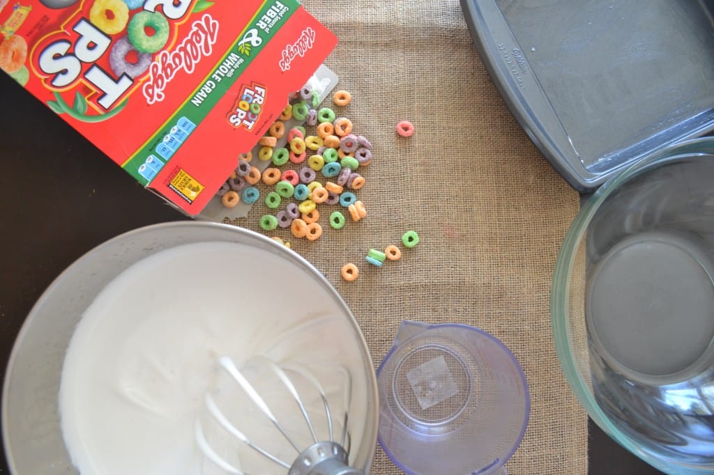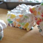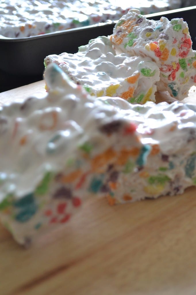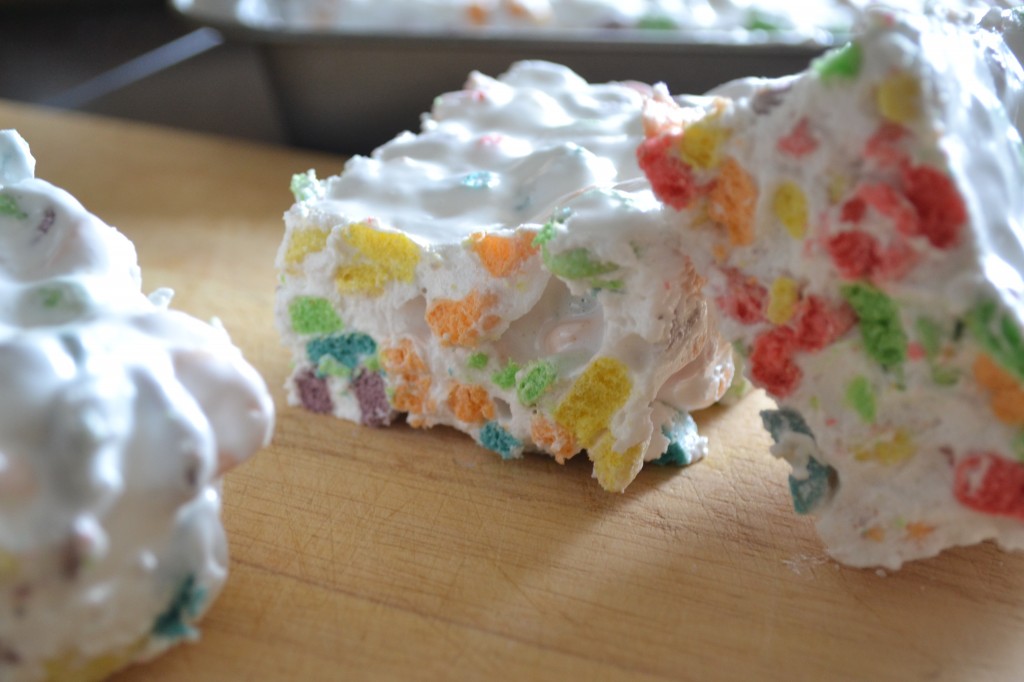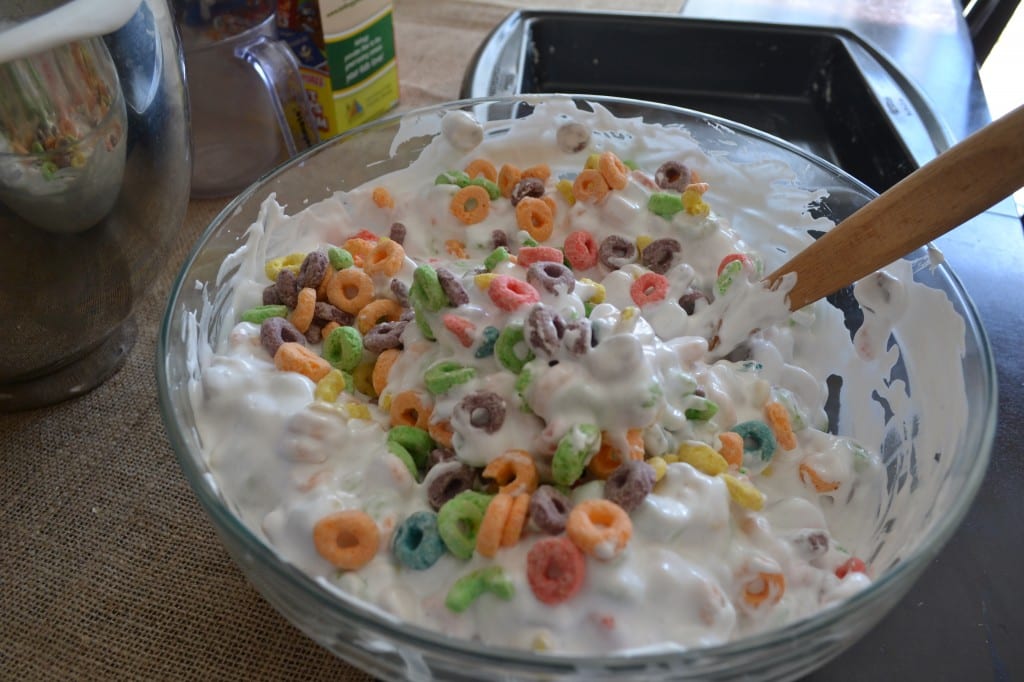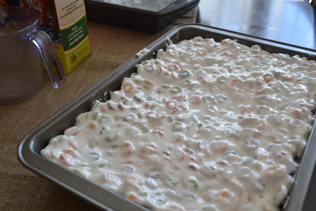 In a large mixing bowl, combine the marshmallow with the fruit loops. Mix until incorporated. Add marshmallow fruit loop mixture to greased and sugared pan. Refrigerate for at least an hour, at most overnight before cutting.