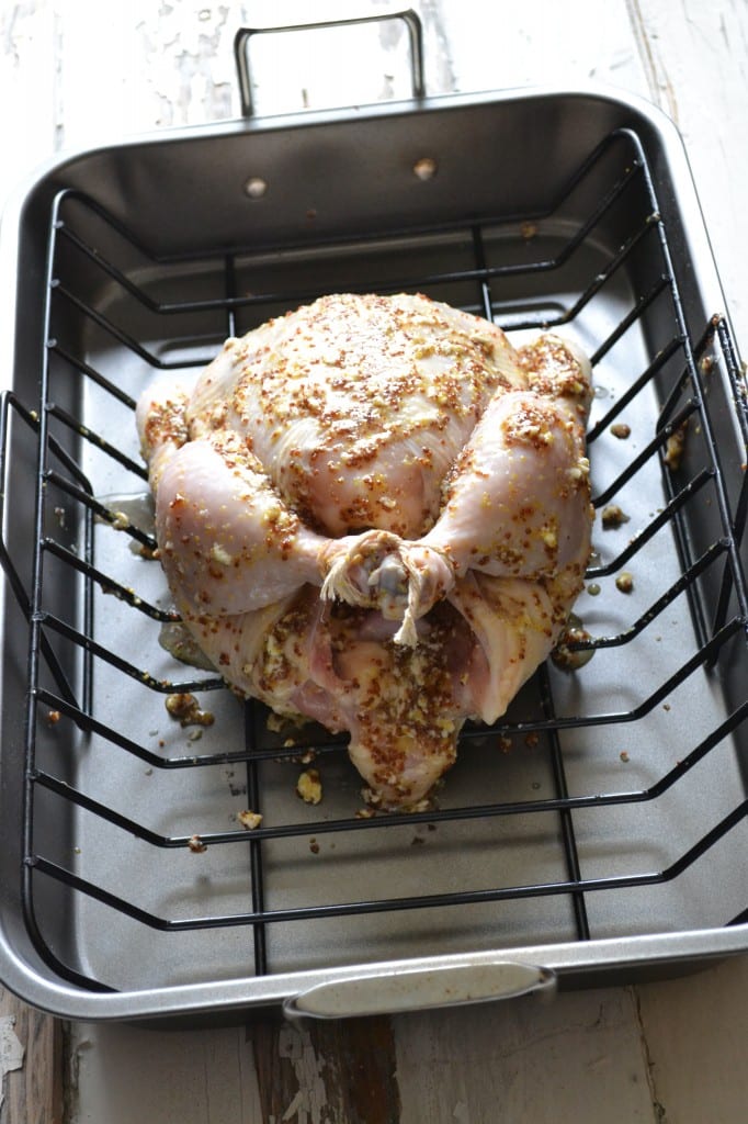 January 16, 2017 at 8:02 amHello, I followed recipe exactly. I loosened skin and stuffed the mixture underneath on breasts, legs and thighs (glad I did). Put the remaining all over the bird (had extra just gobbed it on top)… Cooked it in a v-rack for the one hour, was all dark brown and crispy… grabbed the legs and flipped it over and cooked the remaining time so breast was down in the v-rack. I basted with the pan drippings after I flipped. The bottom was all nice and dark and crispy. I was thinking the extra mixture that I had extra of, I could have waited and put on the bottom of the bird when I flipped. It was pretty dark if people don’t like it that way they could tent it with foil after golden brown. Just want to say it came out awesome and was so moist!! I usually do lemon zest, juice, and tyme and this was a nice change. Love the whole grain mustard!