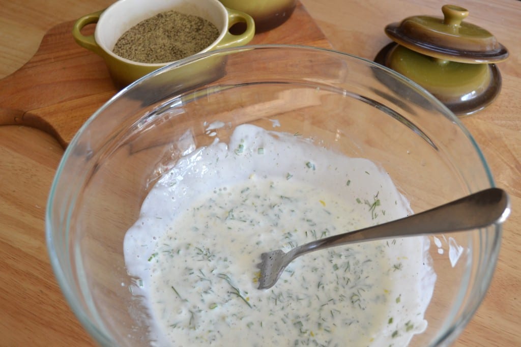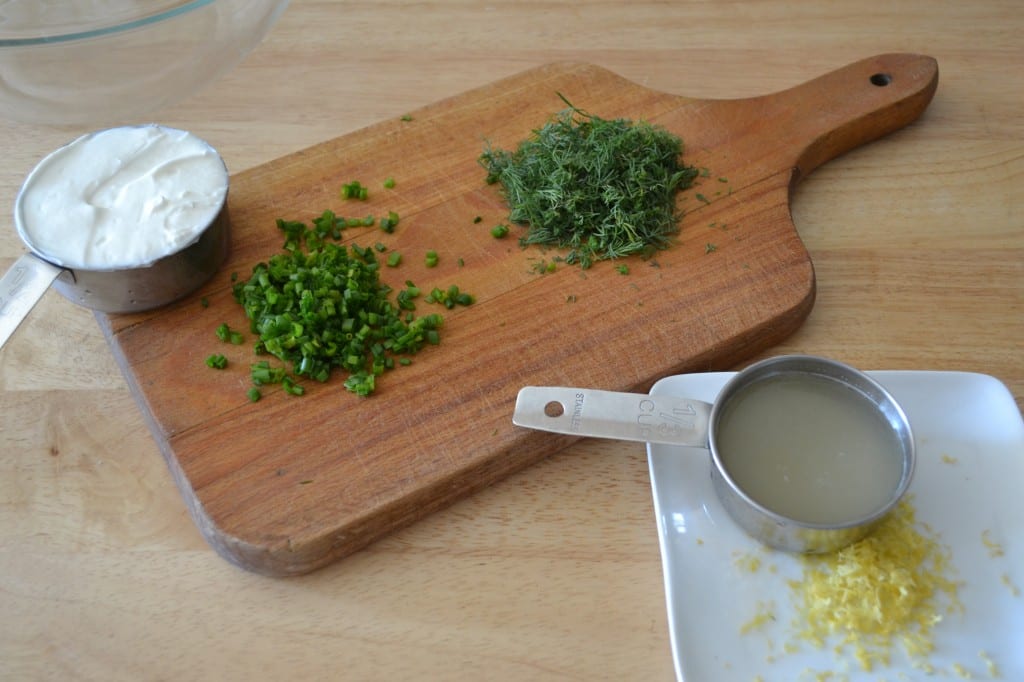 In a small mixing bowl, whisk together the Greek yogurt, lemon juice, and olive oil. Mix in the lemon zest, chives, dill, salt, and pepper.