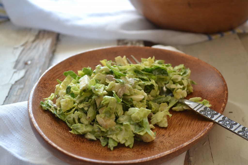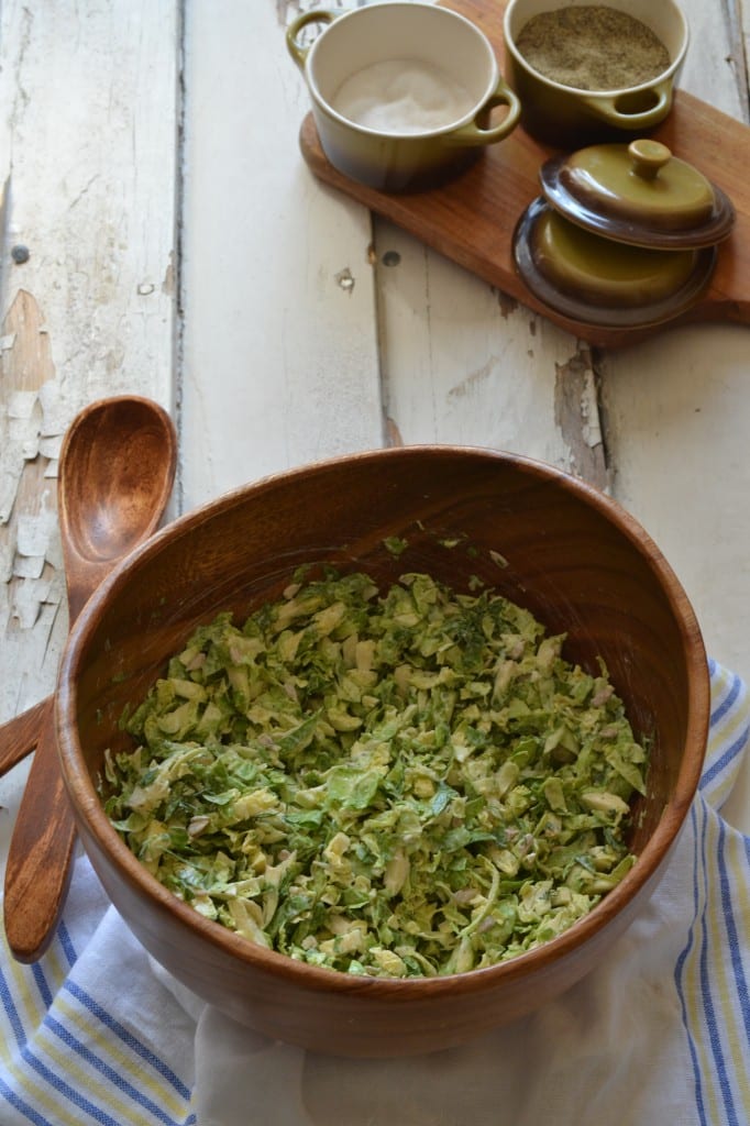 About an hour before serving, combine the shredded Brussels sprouts, sunflower seeds, and dressing in a large serving bowl. Mix well. Let sit at room temperature until ready to serve so the dressing doesn’t seize up.