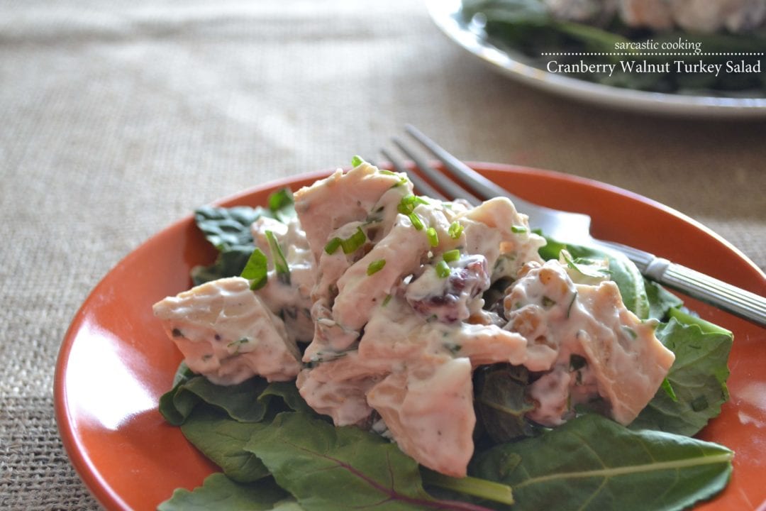 Add the walnuts, turkey/chicken, and cranberries to the dressing. Mix until all ingredients are evenly coated.
