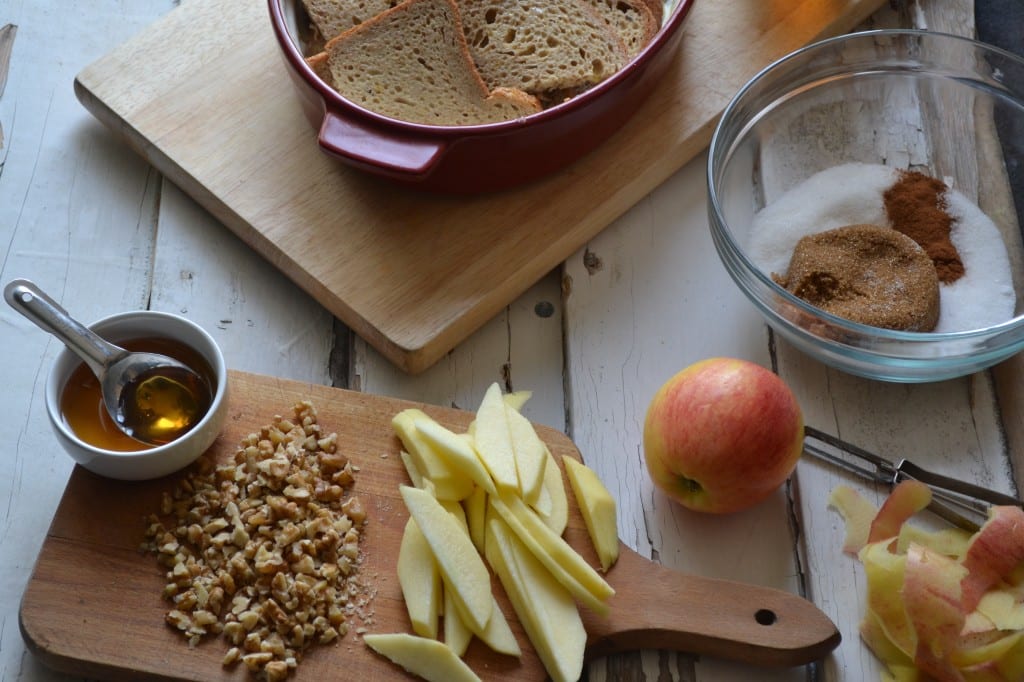 Remove the soaked bread from the refrigerator and remove the plastic wrap. Pour the apple mixture on top of all the bread. Evenly spread it out using a rubber spatula. Bake in the oven for 35 – 40 minutes until golden brown.