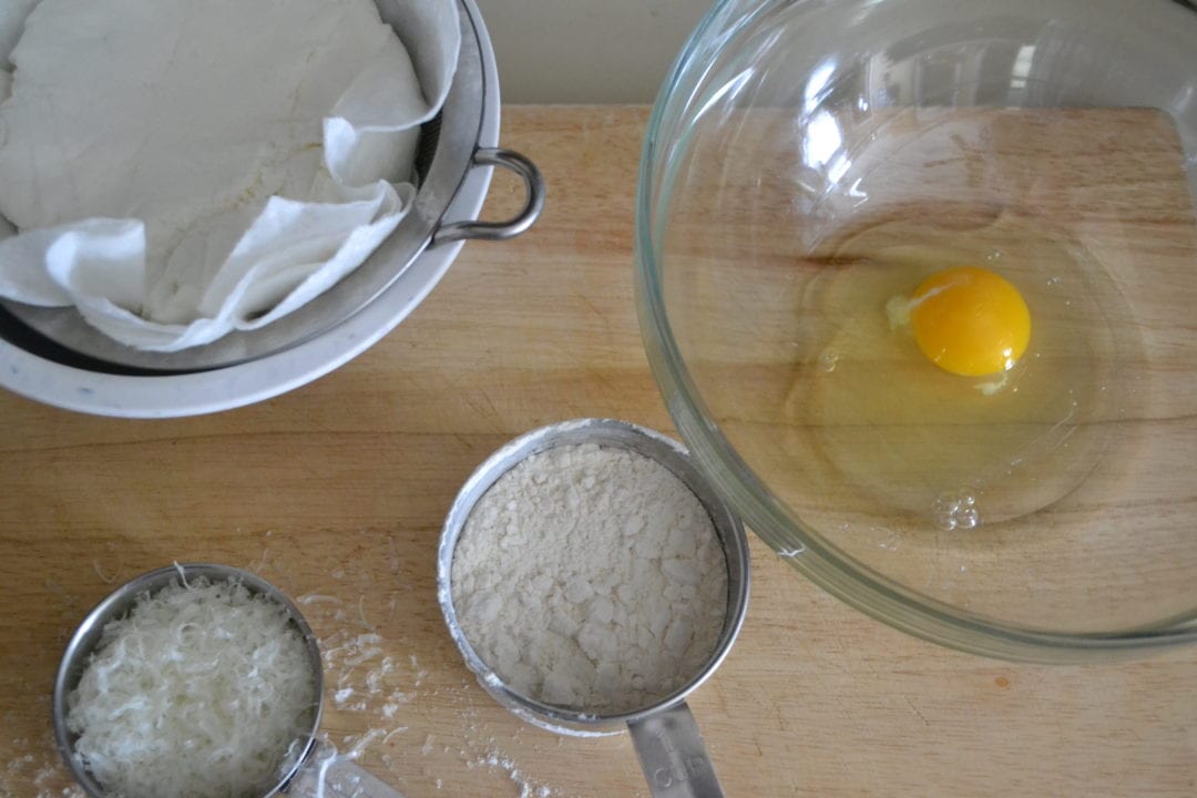 - In a large bowl, combine the strained ricotta, egg, cheese, salt, and ¾ cup flour. Mix until combined. Refrigerate bowl for twenty minutes. In the meantime, bring a large pot of salted water to a boil.