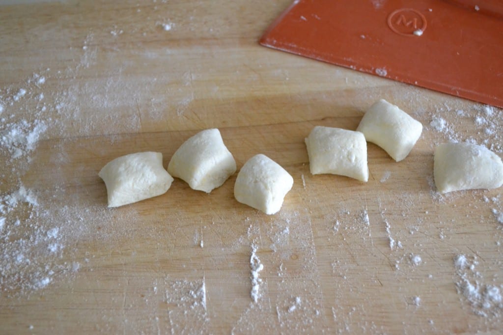 - Lightly dust a work surface with a bit of flour. Take a large handful of dough and, using your hands, roll it into a long ¾ inch thick log. Use a bench scraper or a sharp knife to cut the log up into ½ inch pieces. Place the cut pieces on to a lightly floured baking sheet. Continue this process until all dough is rolled and cut.