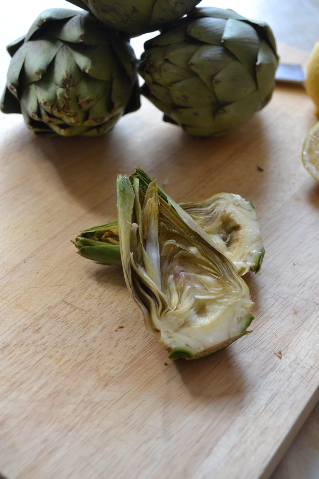 Working with 1 artichoke at a time, using a serrated knife or just pulling them off by hand, trim off all but 2 inches of the leaves. Pull off and discard the dark green outer leaves, then peel and trim the bottom and the stem. Quarter the artichoke and scrape out the hairy choke. Rub the artichoke quarters all over with the lemon half, squeeze the extra lemon juice into a small bowl of water and add the quartered artichoke to the lemon water. Repeat with the remaining artichokes.