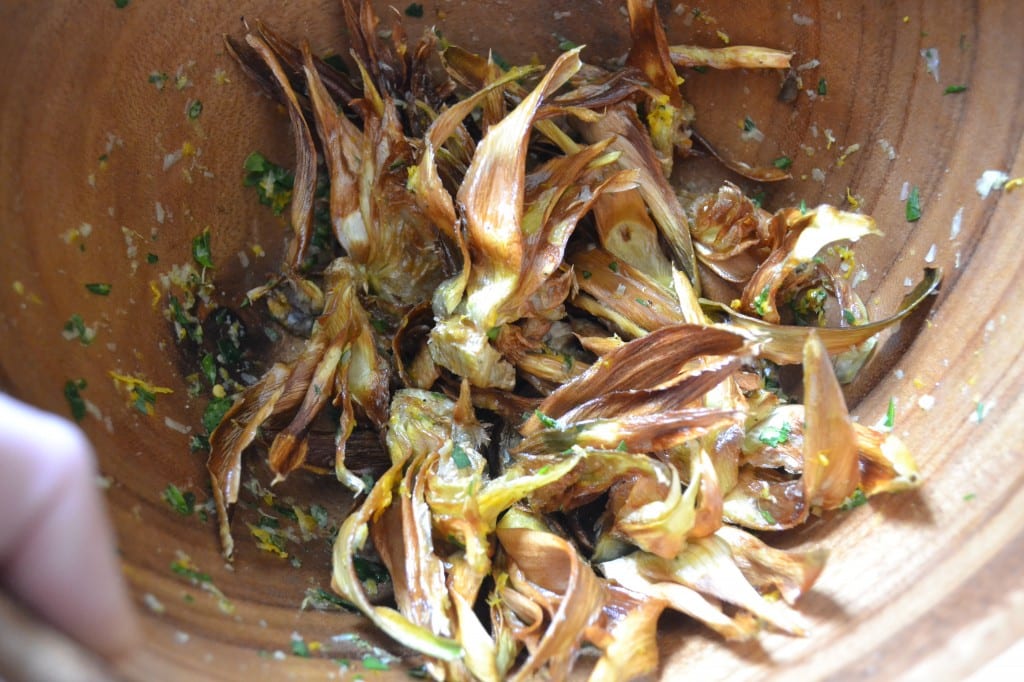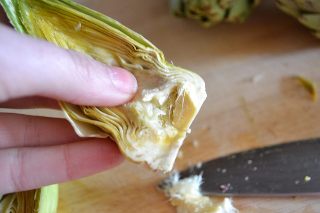 My experience of peeling off a majority of the leaves to get to the heart was a bit prickly, but easy. Then you have to scrape out the hairy choke part—ok, easy.