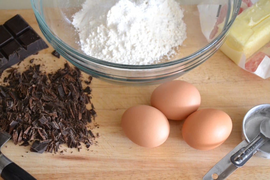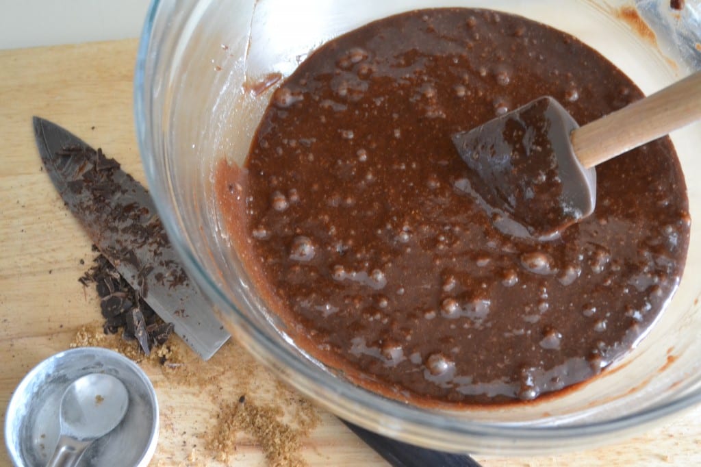 Whisk the sugars into the melted chocolate and butter. Whisk in eggs and yolk, one at a time. Add flour all at once, fold together using a rubber spatula. Stir in chocolate chips when almost all incorporated.
