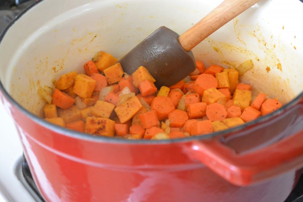 Add carrots and sweet potato to the hot olive oil. Sautee for 7 minutes while stirring occasionally. Add the onions and sauté for 3 minutes while stirring.