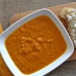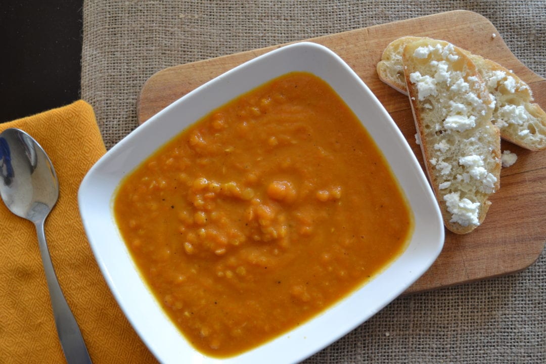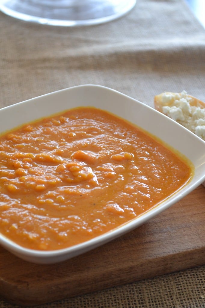 Reduce the heat to low. Using an immersion blender, blend the soup until smooth. If you don’t have an immersion blender, you can add a few cups at a time to a blender and puree until smooth. Once the soup is smooth, add the lentils and increase the heat to medium. Simmer soup for 15-20 minutes until lentils are tender.