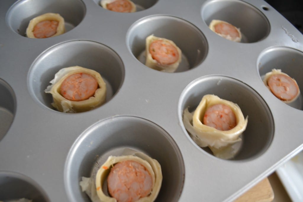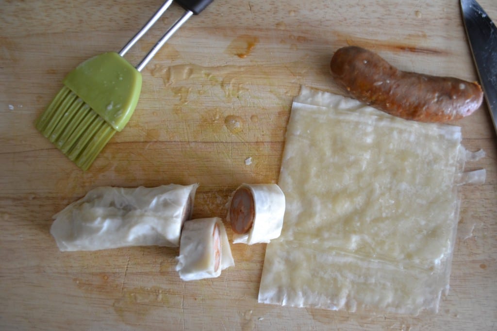 Roll cooked sausage tightly in layered phyllo. Seal the edge with melted butter. Cut into four or five pieces. Place slices in a mini muffin tin. Bake for fifteen minutes, flipping over at the halfway point.