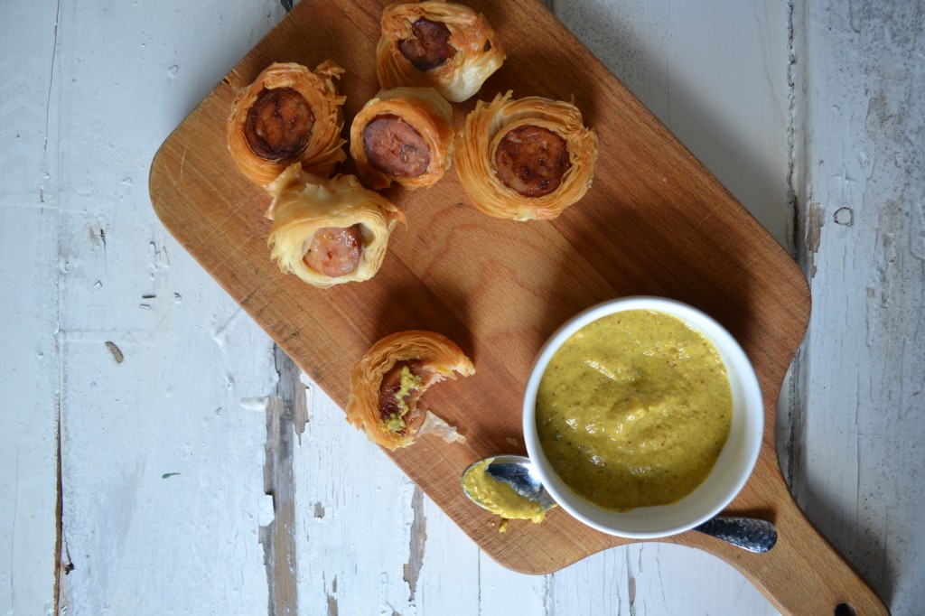 This is the easiest classed up version of everybody’s favorite holiday app. Take your favorite kind of cooked sausage. I used a red wine and cheese chicken sausage from my fave store, Trader Joe’s. You wrap the sausage up in buttery layers of phyllo dough, bake for 15 mins, and boom!