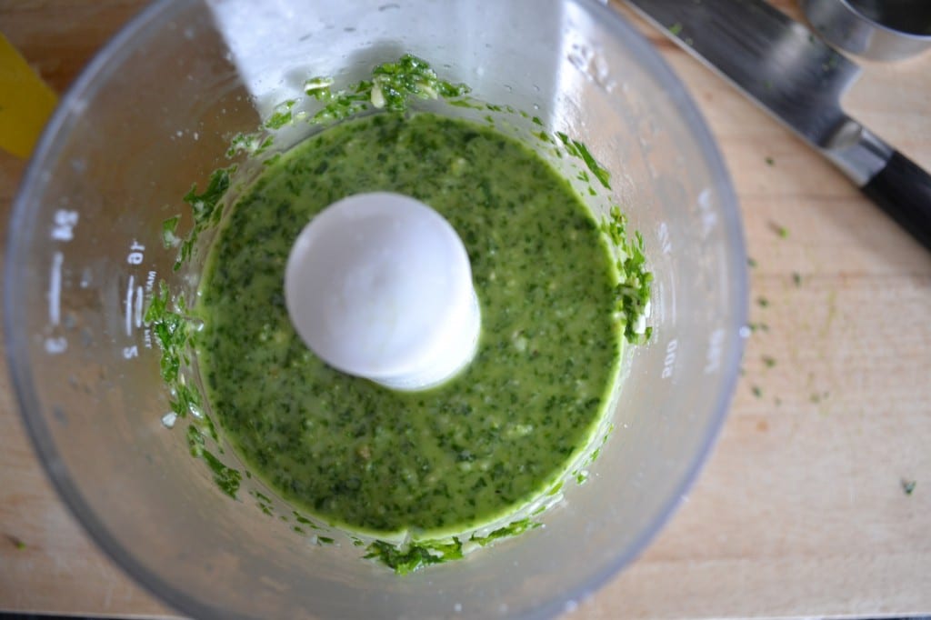 While the potatoes roast, add cheese, pine nuts, salt, pepper, and garlic to a food processor. Pulse for a few minutes until the garlic and nuts are a small mince. Add in the kale, parsley, lemon juice, and olive oil. Pulse until smooth, 1-2 minutes.