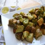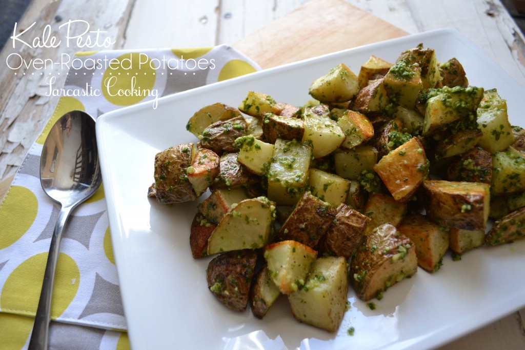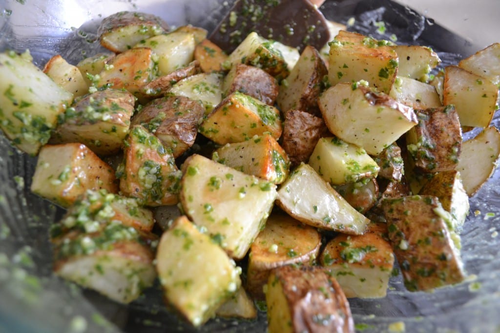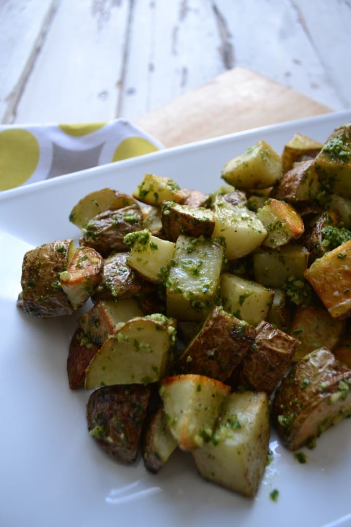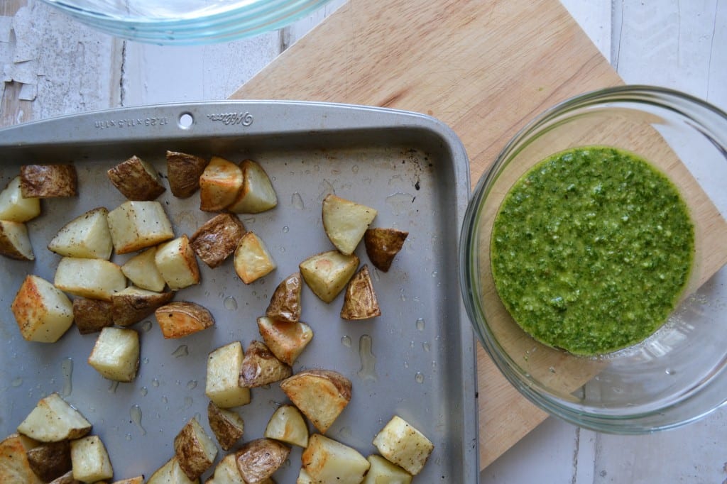 When potatoes are roasted, add to a large bowl along with three tablespoons of pesto. Toss together to evenly coat. Serve right away.