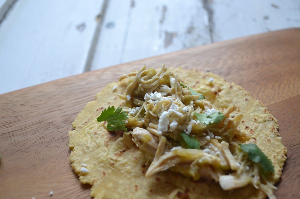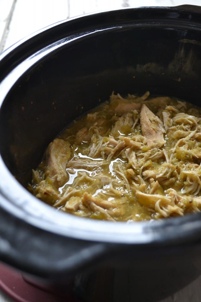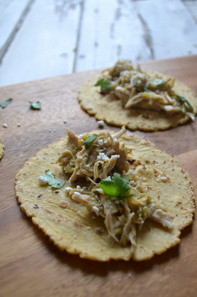 When fully cooked, shred chicken in the pot using two forks. Let sit in crockpot on warm uncovered while you prepare tortillas and toppings. Serve meat on tortillas right away.