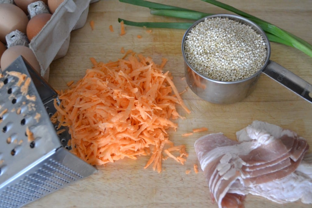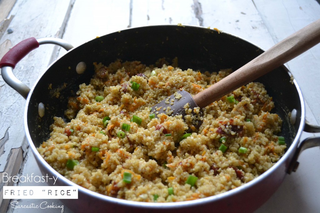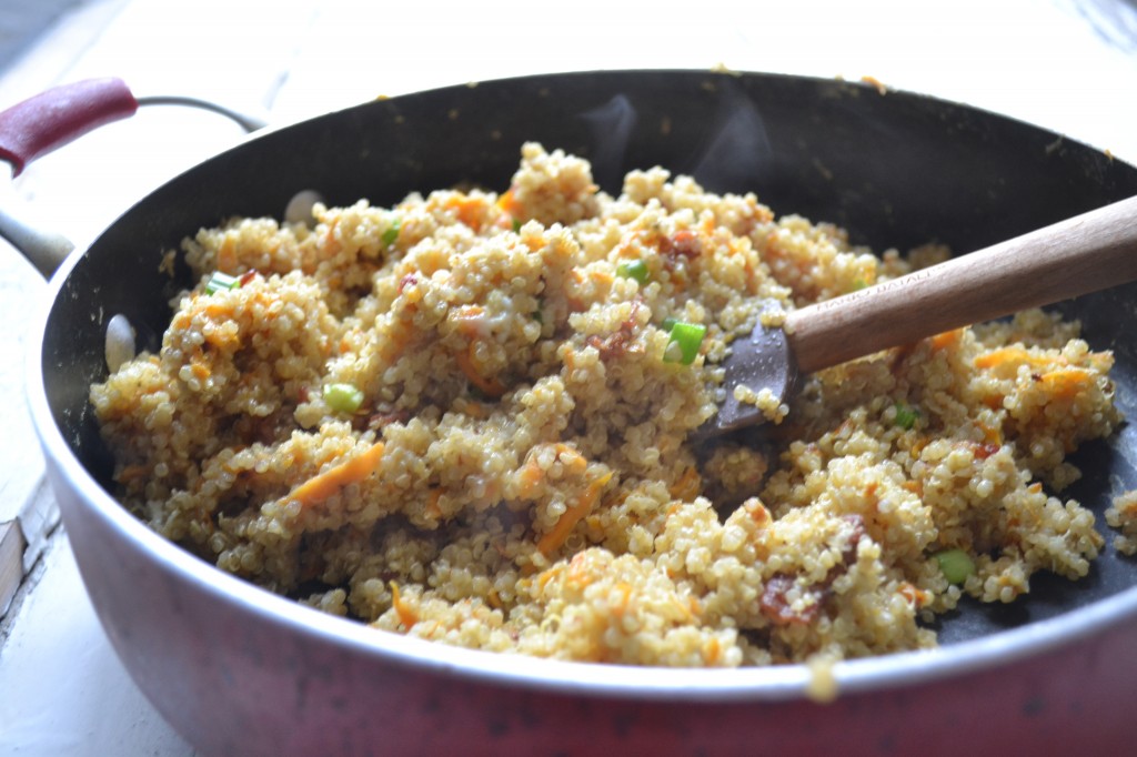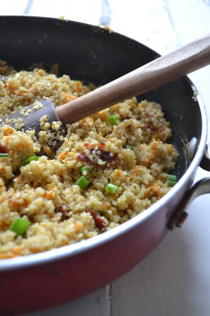 Remove lid, season quinoa with salt, pepper, and crushed red pepper flakes. With the heat on low, add back in the sweet potato and bacon. Create a little well in the center of the quinoa. Pour in the eggs. Let them sit for a few seconds and then stir to combine throughout the quinoa. Add in the green onions. Stir and then remove from heat. Serve right out of the skillet. A few dashes of hot sauce are totally necessary on top!