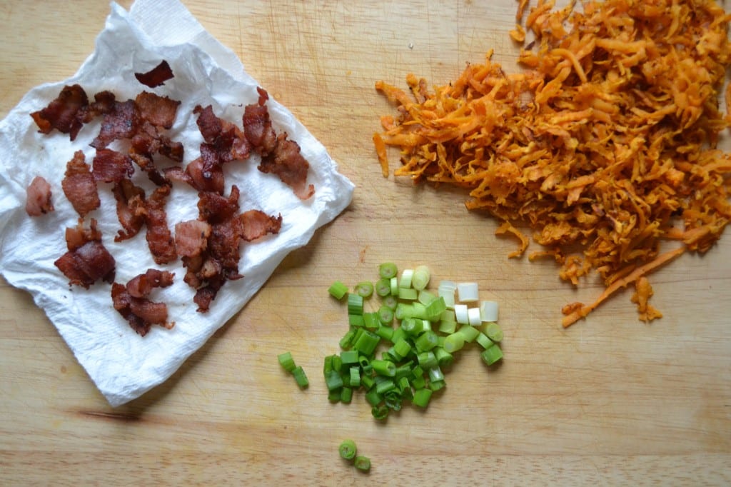 Add shredded sweet potato to the skillet. Reduce heat to medium and cook sweet potato until crisp and golden, about ten minutes. Remove crisp sweet potato and place off to the side for later.